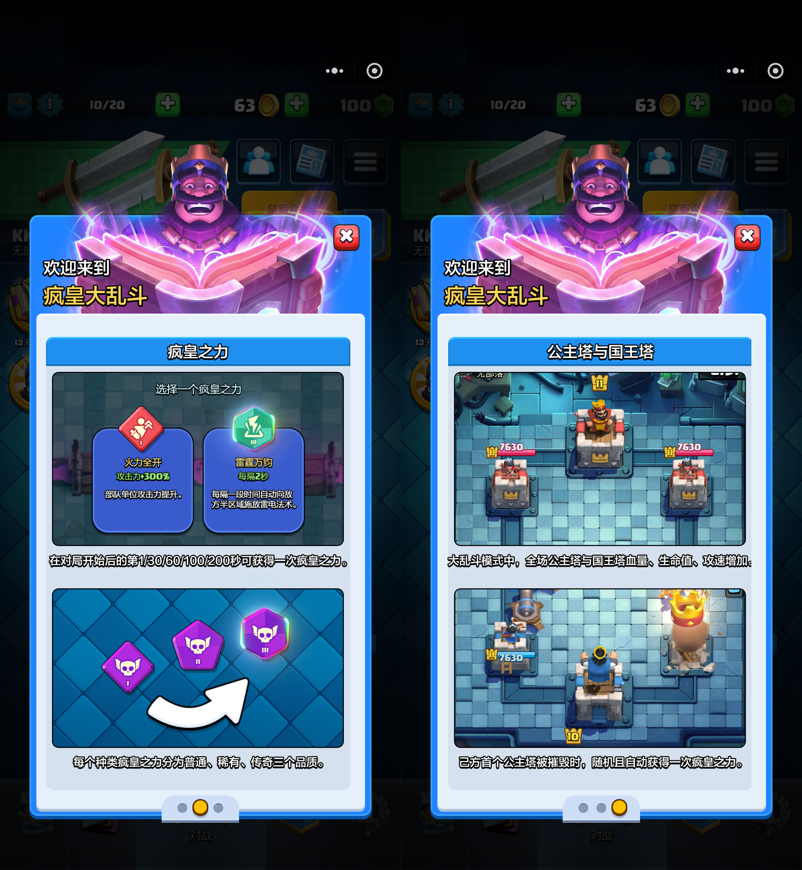 重磅消息!经典策略竞技手游《皇室战争》,现在在微信小程序就能玩了!近日,《皇室战争》官方正式上线微信小游戏版本,并且同步上线了画风突变的全新玩法——「疯皇大乱斗」模式! 不用下载,微信点开即玩! 忘掉动辄几个G的客户端下载,也彻底告别“更新两小时,对战五分钟”的漫长等待!如今,你与一场精彩对战的距离,只差三次点击:打开微信 -> 搜索“皇室战争” -> 点开小程序,就能丝滑加入这场狂欢! 这一次,《皇室战争》以微信小游戏的形式焕新登场,真正实现了 “零下载、零更新、零负担” 。实现了“即搜即玩”的特性,老玩家回归毫无压力,新用户的尝鲜体验也前所未有的顺畅。基于微信生态,它也天然具备了便捷的社交分享属性,无论你是想给朋友“秀”一把战绩,还是直接邀请好友来一局,都变得异常简单。 疯皇大乱斗模式上线,体验“合法开挂”的快感! 而随小程序一同亮相的 「疯皇大乱斗」 模式,则是本次最大的亮点。它完全颠覆了《皇室战争》传统的竞技玩法,主打一个“爽玩”。每个赛季官方将为每位玩家提供46张卡牌,并且每张卡牌出生就是9级,可以任由玩家自由搭配,开创属于自己的全新玩法。