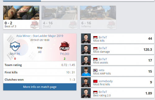 首先是BP环节,与其他所有的比赛一样,Tyloo一上来就ban掉了自己并不熟悉且对方还较为擅长的Nuke,而MVP则是移除掉了他们不喜欢的Overpass。随后Tyloo抢到了自己昨天发挥完美的Dust2,韩国人拿下了亚洲人在近期要最为喜欢的Inferno。MVP去掉了昨天Tyloo同样发挥尚可的火车后,Tyloo去掉了跳楼大厦将Mirage这一两支队伍都无比熟悉的地图留了下来。最终地图池还是亚洲熟悉的老三样,Dust2、Inferno、Mirage,相信这三张地图也是国内CSGO玩家玩的最多的三张地图了。
